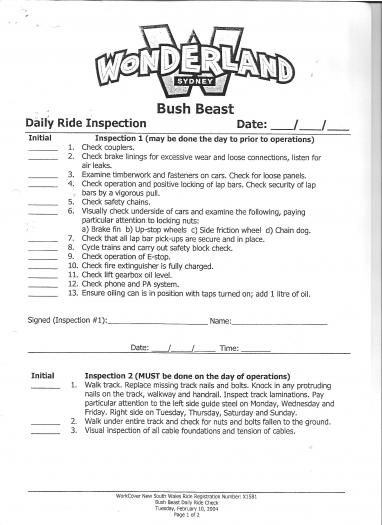 Bush Beast Daily Ride Check Other related pages:Bush Beast OperationBush Beast Construction Roller coaster Photos Bush Beast Videos Bush Beast light sensor layout Bush Beast Demolition Bush Beast Height Restriction Risk Assessment Bush Beast after closure